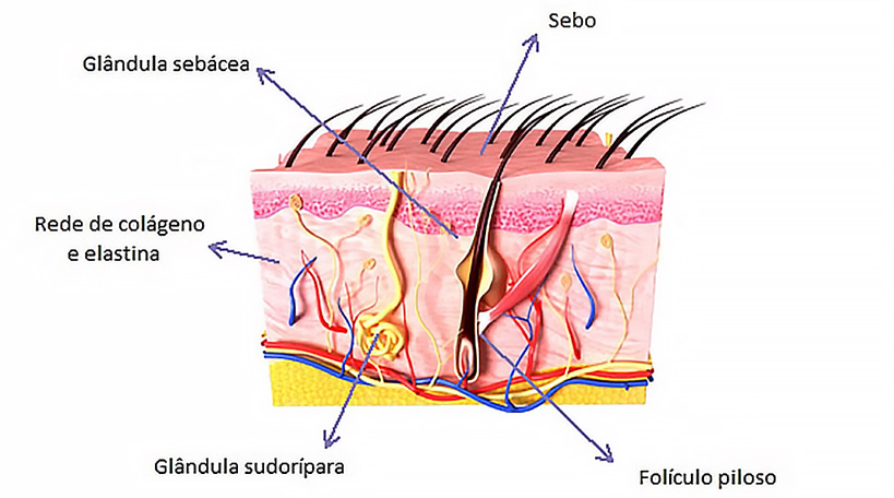 Fibras de colagénio e elastina (proteínas que permitem o encolher/esticar da pele)